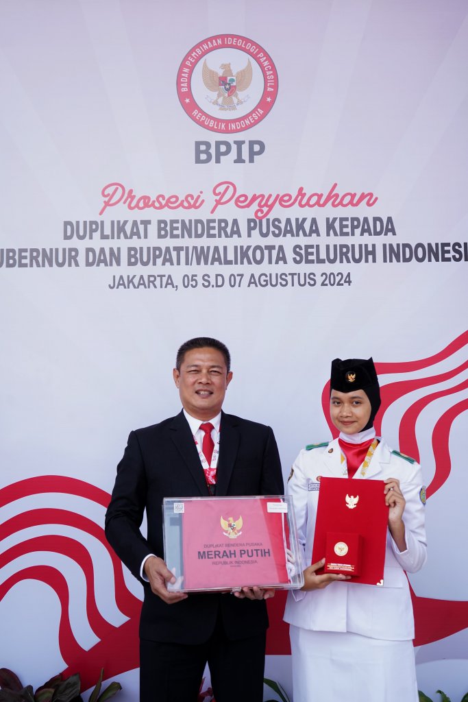 BeritanyaInfo, Indramayu – Badan Pembinaan Ideologi Pancasila (BPIP) menyerahkan duplikat bendera pusaka kepada para kepala daerah se-Indonesia, dalam rangka menyambut hari ulang tahun (HUT) Kemerdekaan RI ke-79, di Balai Samudera, Jakarta Utara, pada Selasa, 6/8/2024.