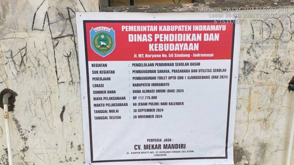 Dalam pelaksanaan kegiatan pembangunan sarana prasarana dan utilitas sekolah dalam hal ini pembangunan Toilet di UPTD SDN 1 Ujunggebang di kerjakan oleh CV.MEKAR MANDIRI yang beralamat di Jl.Karya Bakti No.21 Kedung Krisik Selatan-Cirebon dengan menggunakan anggaran Dana Alokasi Umum (DAU) Tahun 2024 sebesar Rp.117.775.000,-.