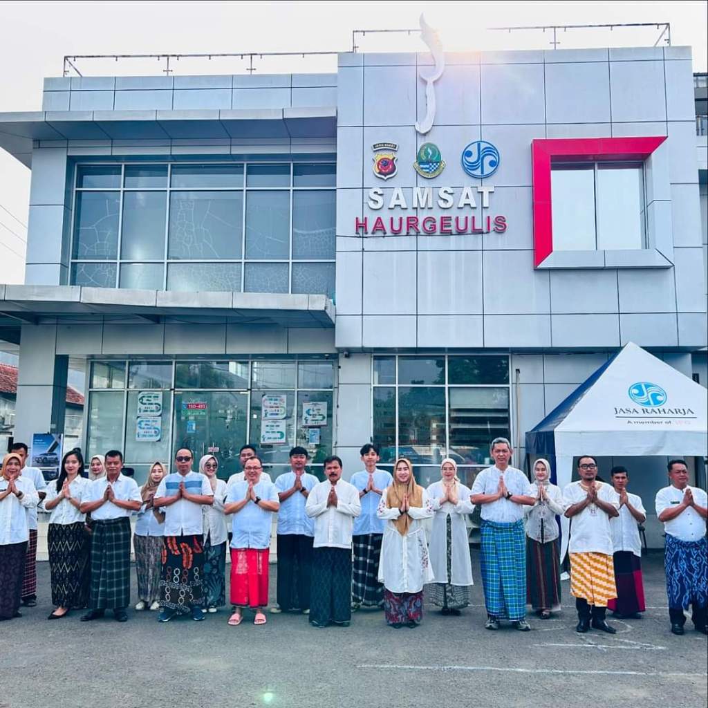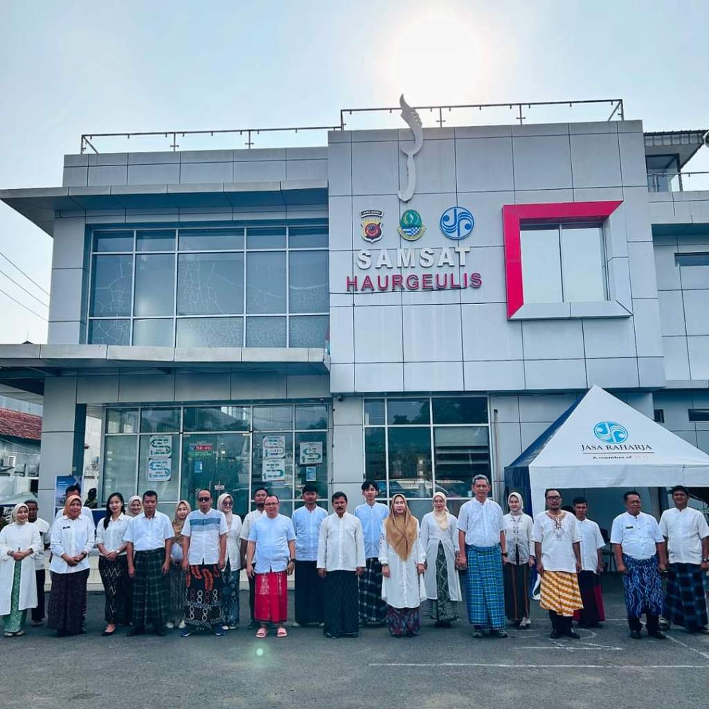 Terlihat para ASN dilingkungan Samsat Haurgeulis memakai sarung tenun jenis sarung Majalaya dan diikuti oleh Kepala P3DW Indramayu II Haurgeulis Bapak Deni Handoyo beserta jajaran.