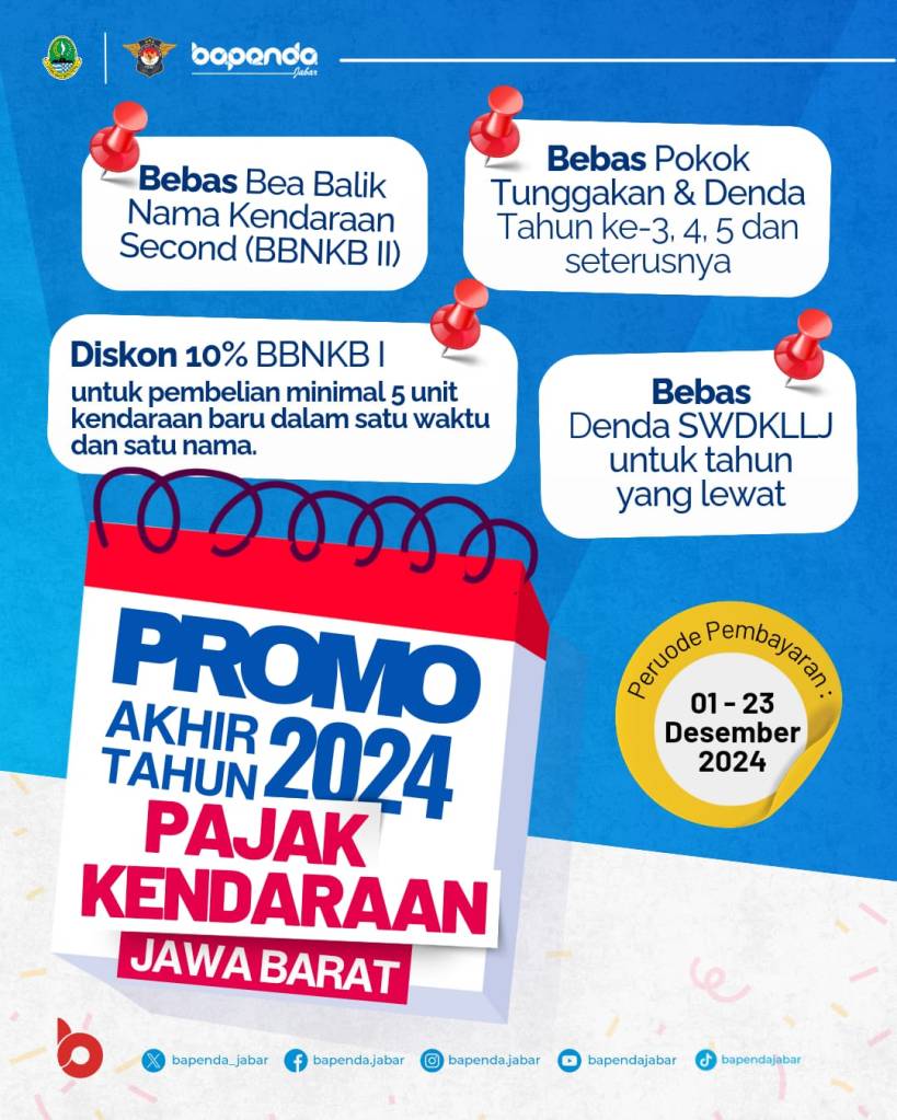 Menurut informasi, Bapenda Jabar akan menggelar promo pemutihan dan keringanan pajak kendaraan sampai tanggal 23 Desember 2024 untuk wilayah Jawa Barat.