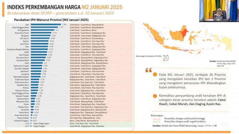 Sementara itu, berdasarkan laporan Badan Pusat Statistik (BPS), pada minggu ke 2 Januari 2025 terdapat 36 provinsi yang mengalami kenaikan IPH dan 2 provinsi yang mengalami penurunan IPH dibandingkan bulan sebelumnya. Adapun komoditas penyumbang andil IPH di sebagian besar provinsi tersebut adalah Cabai Rawit, Cabai Merah, dan Daging ayam ras.