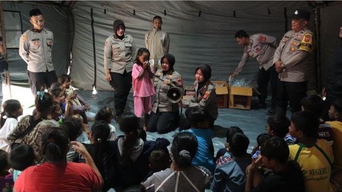 Kedatangan rombongan polisi ini membuat ceria anak-anak di pengungsian Balai Desa Kertawinangun.