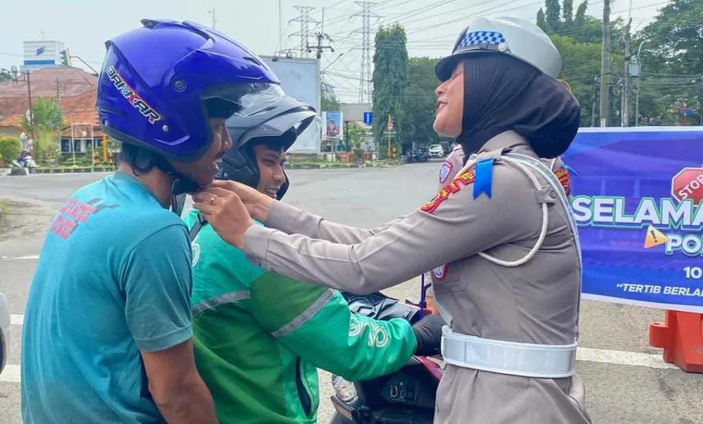 Yang kedapatan tidak mengenakan helm saat berkendara, petugas Sat Lantas Polresta Cirebon memberikan helm secara gratis. Juga memberi imbauan langsung kepada pengendara agar patuh akan aturan lalu lintas.