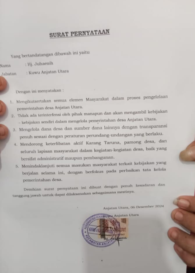 Saat menemui pengunjuk rasa Camat Anjatan Uus Wuspito mengatakan,”dengan transisi kepemimpinan kemarin saya sudah melayangkan surat,surat yang saya layangkan itu belum ada rekomendasi ataupun gambaran dari BPD,jadi belum bisa melayangkan ke Bupati pada hari ini TPK maupun BPD untuk membuat potret atas tuntutan tersebut untuk di analisa sebagai bahan saya untuk meneruskan surat tersebut ke Bupati Indramayu”ucapnya.