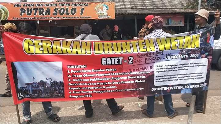 Dalam aksi tersebut ada Empat (4) tuntutan pendemo 1.Pecat Kuwu Drunten Wetan 2.Pecat Oknum Pegawai Kecamatan Gabus Wetan 3.Audit dan Publikasikan ADD/DD Yang Masuk Ke desa Drunten Wetan dan 4.Usut Tuntas Penggelapan Dana Pendaftaran Program PTSL aksi tersebut berjalan tertib dan aman.
