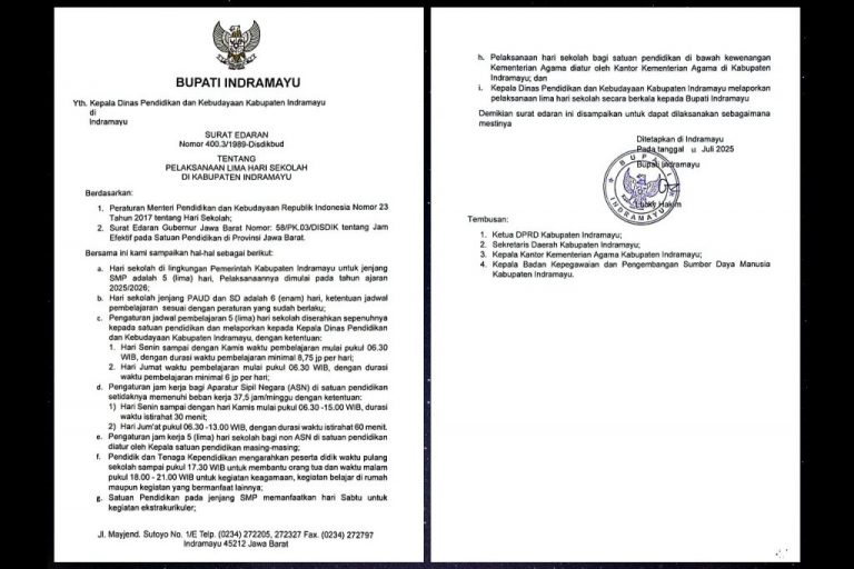 BeritanyaInfo, Indramayu – Pemerintah Kabupaten Indramayu melalui Surat Edaran Nomor 400.3/1989-Disdikbud yang ditandatangani oleh Bupati Indramayu Lucky Hakim, mengumumkan pelaksanaan lima hari sekolah untuk jenjang Sekolah Menengah Pertama (SMP) di seluruh wilayah Kabupaten Indramayu. Kebijakan ini akan mulai berlaku pada tahun ajaran 2025/2026.