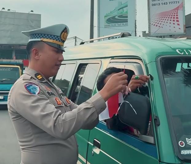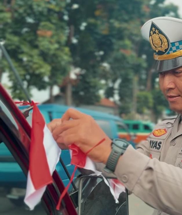 BeritanyaInfo, Cimahi – Personel Jajaran Sat Lantas Polres Cimahi Jawa Barat, turun langsung ke jalan raya untuk bagikan bendera merah putih kepada warga sekitar juga para pengendara dan pengguna jalan yang melintas sebagai bentuk, semangat menyambut Hari Ulang Tahun Kemerdekaan Republik Indonesia Ke – 80.