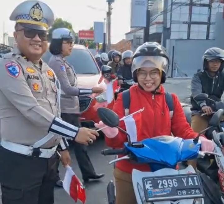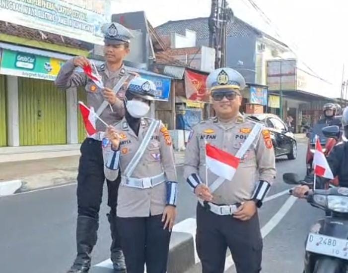BeritanyaInfo, Kuningan – Personel Jajaran Sat Lantas Polres Kuningan Jawa Barat, turun langsung ke jalan raya untuk bagikan bendera merah putih kepada warga sekitar, baik pejalan kaki juga para pengendara dan pengguna jalan yang melintas sebagai bentuk, semangat menyambut Hari Ulang Tahun Kemerdekaan Republik Indonesia Ke – 80.