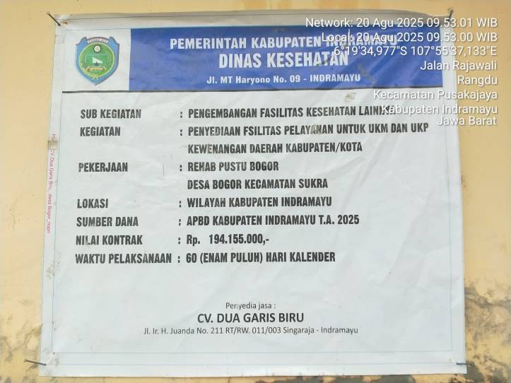 Pelaksanaan rehab PUSTU desa Bogor dikerjakan oleh CV.DUA GARIS BIRU yang beralamat di Jl.Ir.H.Juanda No.211 RT/RW 011/003 Singaraja-Indramayu dari Dinas Kesehatan Kabupaten Indramayu.